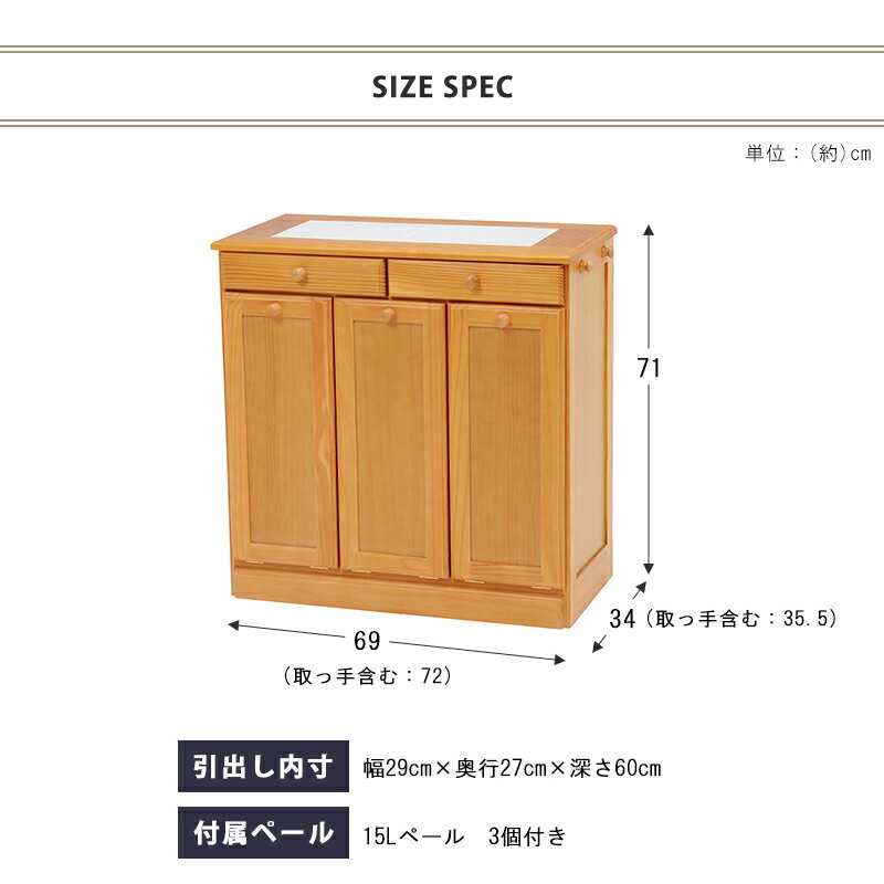 サイズおよび重量 (約)幅69×奥行34×高さ71cm 素材 / 材質 ■素材・成分:パイン材、MDF化粧 ■完成品(取っ手のみお客様での取付け) ■ 引出内寸:(約)幅29×奥行27×深さ6cm ■ 15リットルペール3個付き ■ キャスター付き 備考 送料無料 (但し、北海道・沖縄・離島にお届けの場合は別途運賃をご請求致します。
