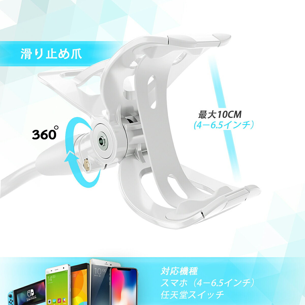 ♥【商品説明】 ◆【商品名】スマホアームスタンド ◆【カラー】ホワイト&ブラック ◆【製品重量】360g ◆【アームの長さ】約850mm ※1-2CMの誤差ご了承をください ◆【梱包内容】スタンド本体 ◆【特徴】 【対応機種】4-6.5インチスマホに対応。